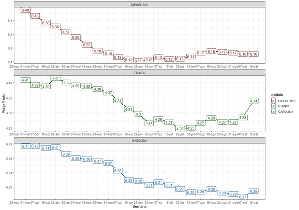 Já o diesel S-10 apresentou queda no preço marginal de R$ 0,01 no preço médio nacional, fechando a segunda semana de setembro a R$ 6,16 por litro. A maior alta estadual do diesel foi registrada no Pará, com avanço de 0,7%. A maior redução do diesel ocorreu em Alagoas, com queda de 1,7%. O diesel mais caro do Brasil também está no Acre (R$ 7,87 por litro), enquanto o diesel mais barato é encontrado em Pernambuco, a R$ 5,83.