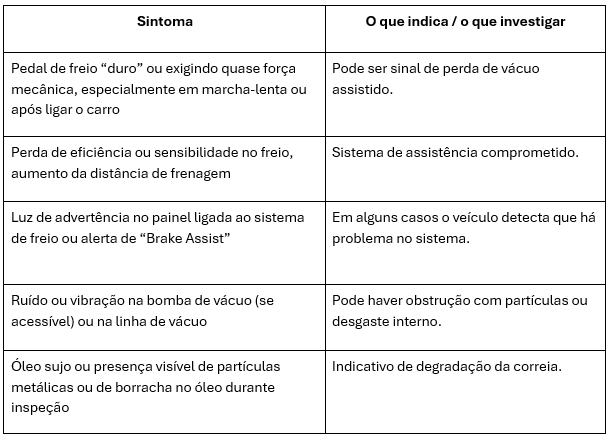 ○ Alertar sobre sinais de pedal duro ou perda de assistência de freio.