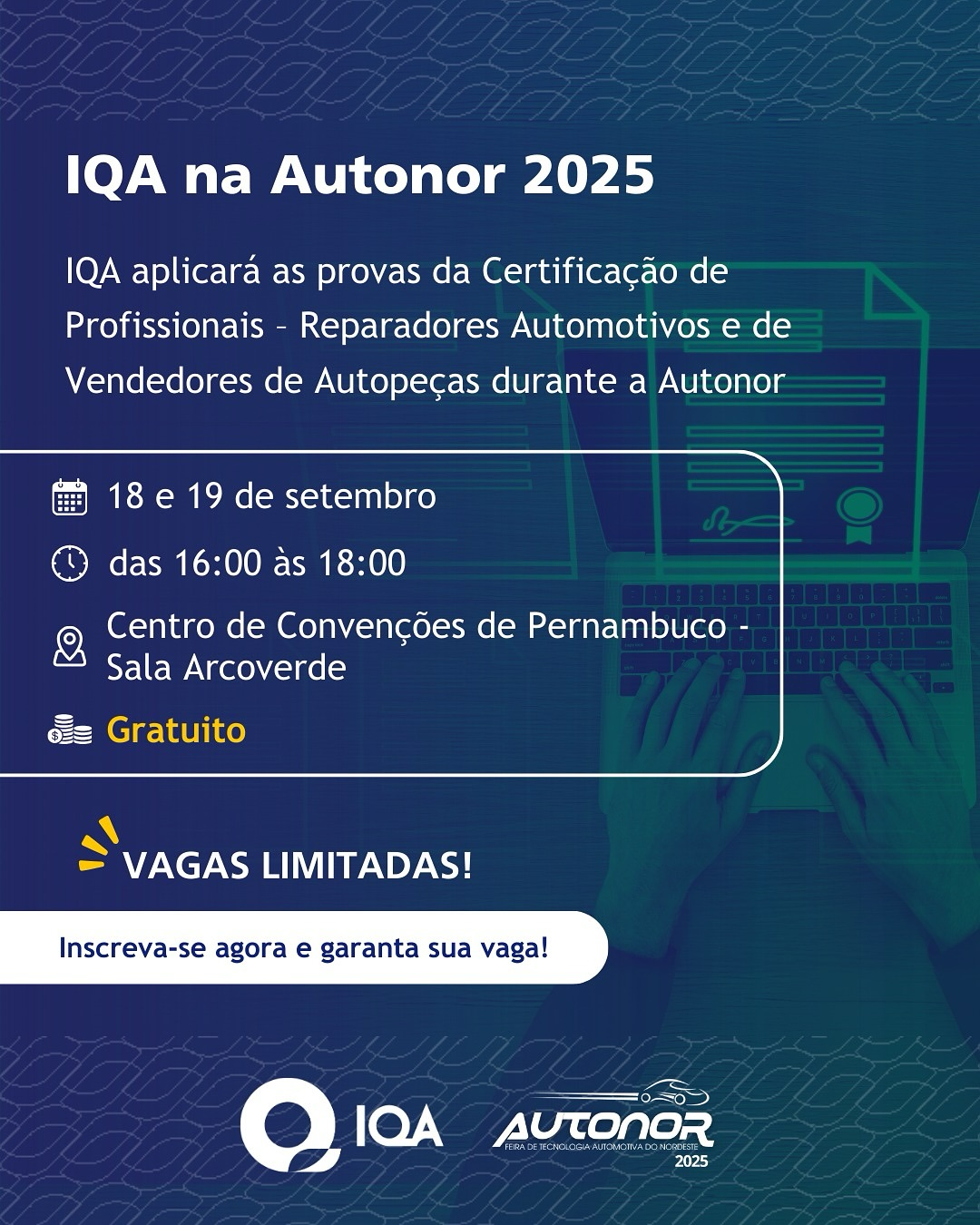 Nos dias 18 e 19 de setembro, o Instituto da Qualidade Automotiva (IQA) marcará presença na Feira Autonor, em Recife (PE), oferecendo provas gratuitas para a Certificação de Reparadores Automotivos e Vendedores de Autopeças. A iniciativa abrange áreas como direção, freio, suspensão, motores, funilaria, pintura, retífica de motores, veículos elétricos e híbridos (VEH) e vendas de autopeças, visando qualificar profissionais do setor automotivo.